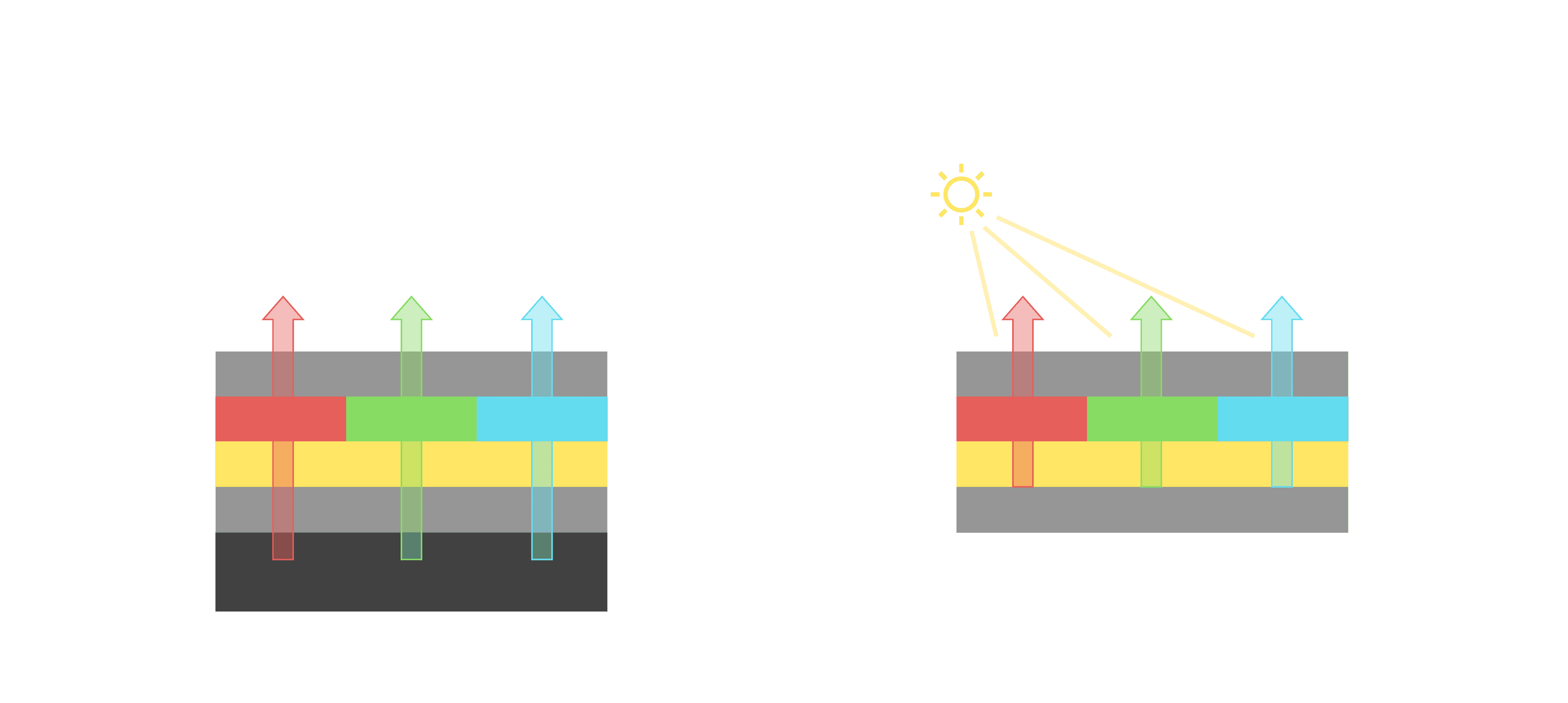 与传统需搭配背光单元的液晶显示相比,,反射式液晶技术不仅更省电、、、、更轻薄,,,且即便在艳阳下仍能清晰显示。。。。此外,,,少了背光单元,,也大幅降低了 LED 蓝光伤害眼睛的疑虑。。。