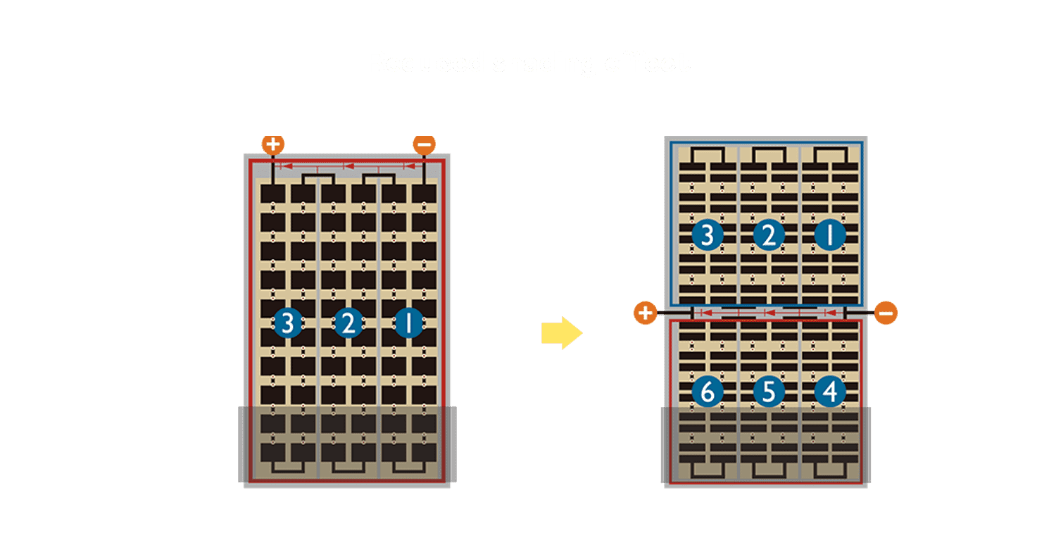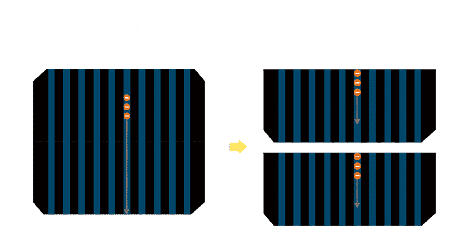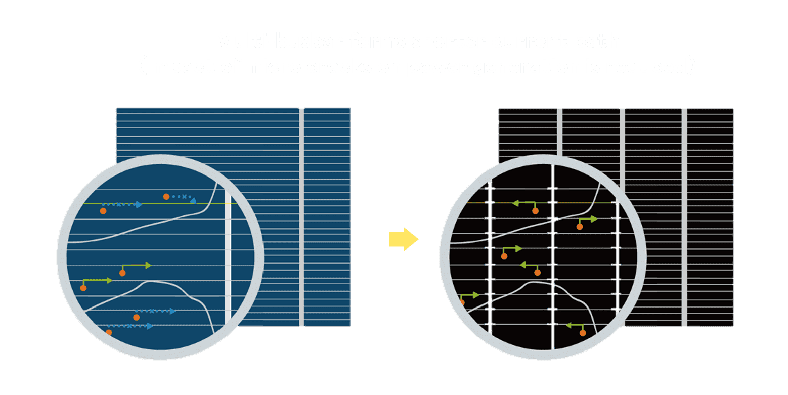 - 结合半切电池,,降低遮阴影响、、、、提升模组抗隐裂能力、、、、并减少电阻损耗,,进一步提升模组发电效能。。